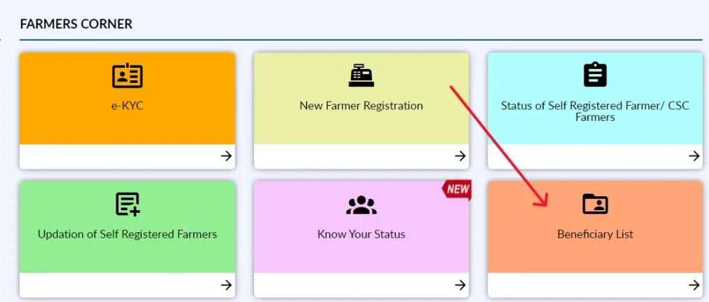 https://pmkisan.gov.in/पर जाएं।सही विकल्प चुनें: होमपेज पर मौजूद “Farmers Corner” सेक्शन में जाकर “Beneficiary List” विकल्प पर क्लिक करें।